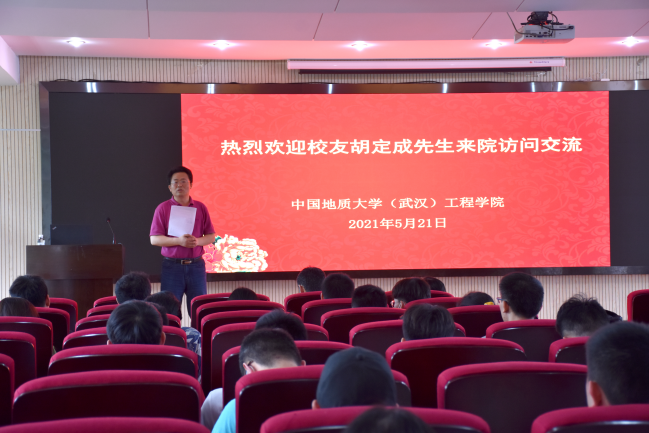 胡定成先生回顾了在母校的求学经历和工作后的成长历程,致谢母校对他的培养和信任,表示将积极履行客座教授职责,努力为学校和学院科学研究、专业建设和教育教学贡献力量。