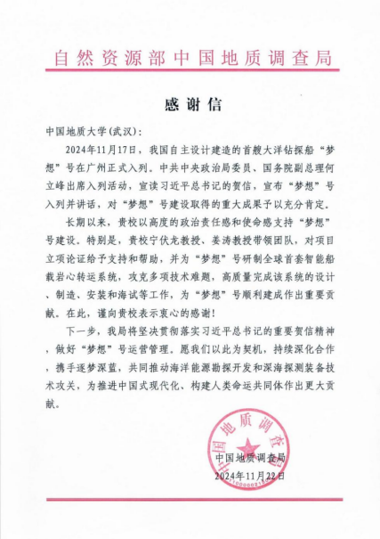 “梦想”号海试成功并正式入列,自然资源部中国地质调查局向我校发来感谢信,对学校以高度的政治责任感和使命感支持“梦想”号建设表示感谢。