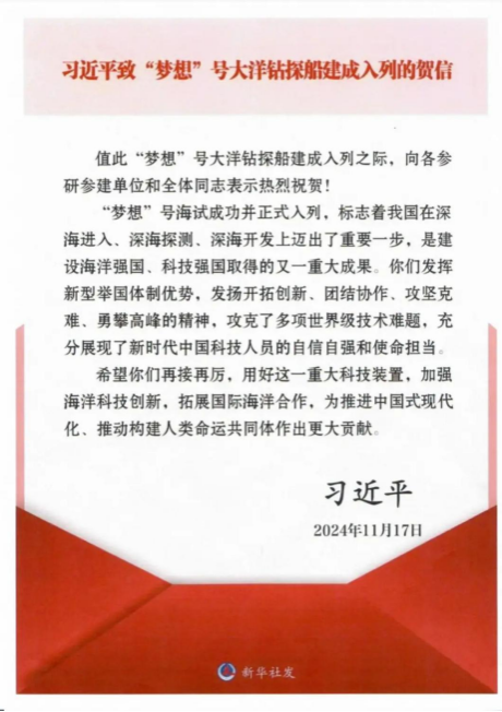 习近平总书记祝贺“梦想”号大洋钻探船建成入列